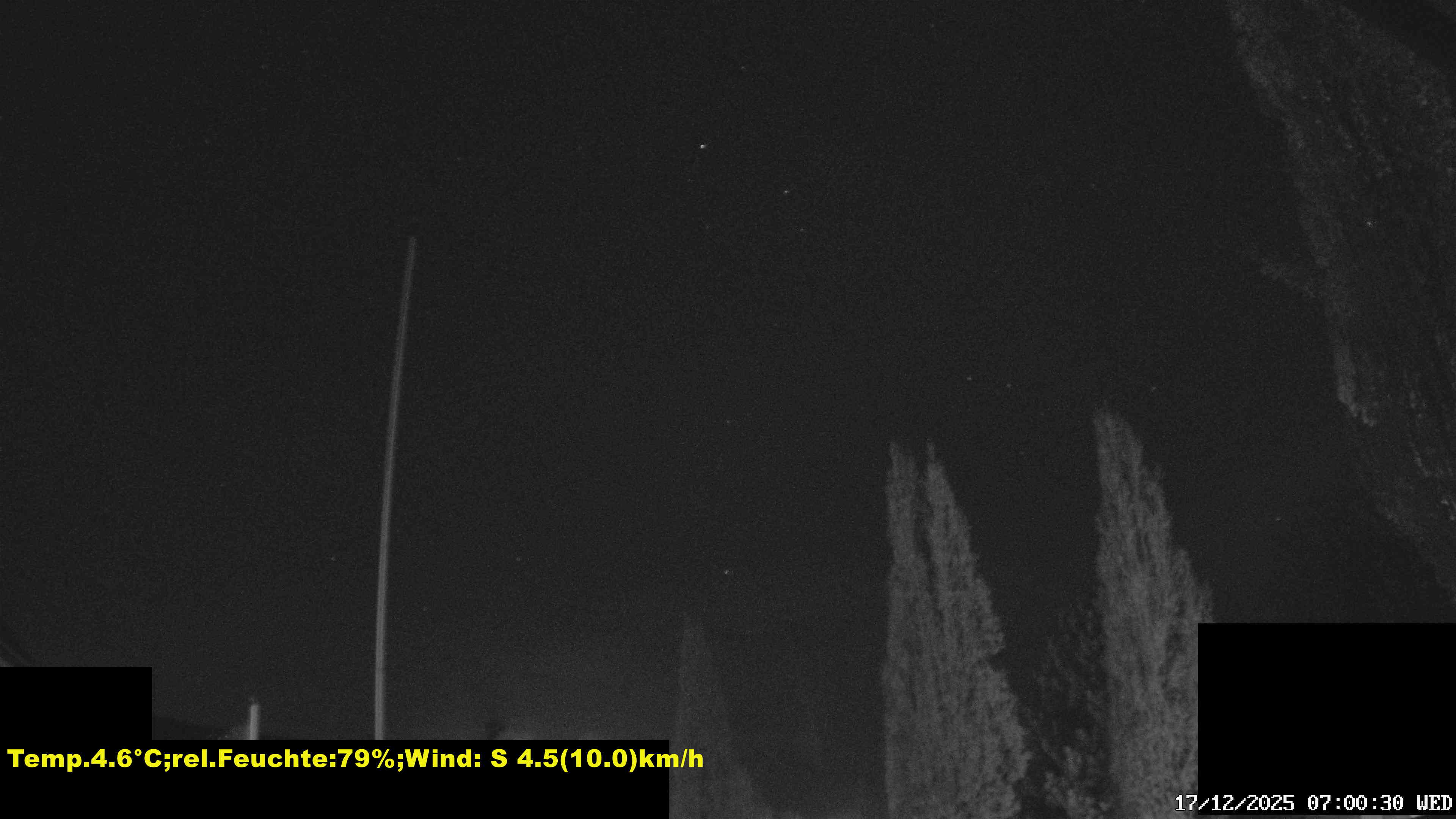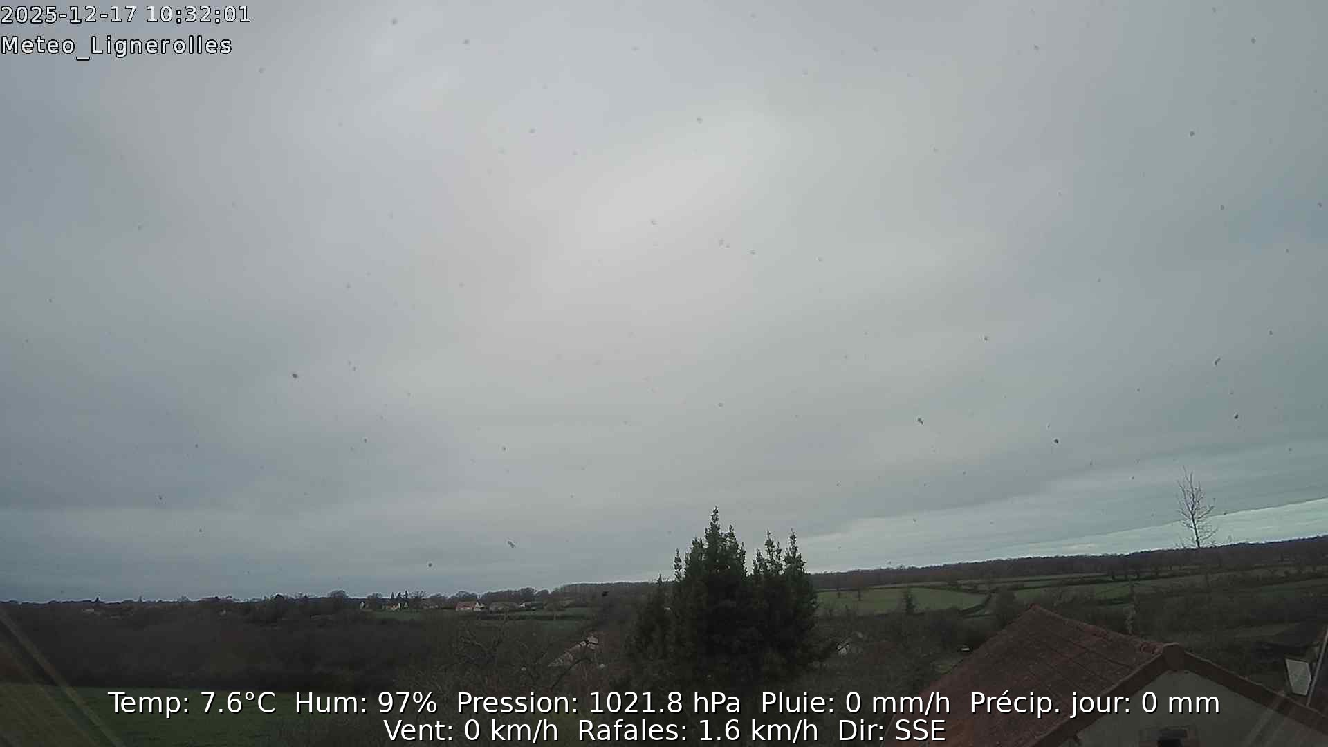 Croisette (Pas de Calais) 137m, le 17/12/2025 à 12H00 Nébulosité : Très nuageux 7/8 Cu Sc Phénomène ambiant : Temps frais et très nuageux, faibles éclaircies, Vent faible. Visibilité : 6km Pression relative : 1018,8hPa, Tendance : Hausse Température : 9,6°C - Minimum de la nuit : 7,4°C à 01:16H - Maximum de la veille : 12,7°C à 13:42H Humidité relative : 96% Point de rosée : 8,9°C Température apparente : 8,4°C Humidex : 9,6°C - Indice de chaleur : 9,6°C Pluie : 0,0mm sur 24 Heures Direction du vent : SO Vitesse du vent : 3kmh Rafales du vent : 19 km à 11:26H Vent dominant : SSO
