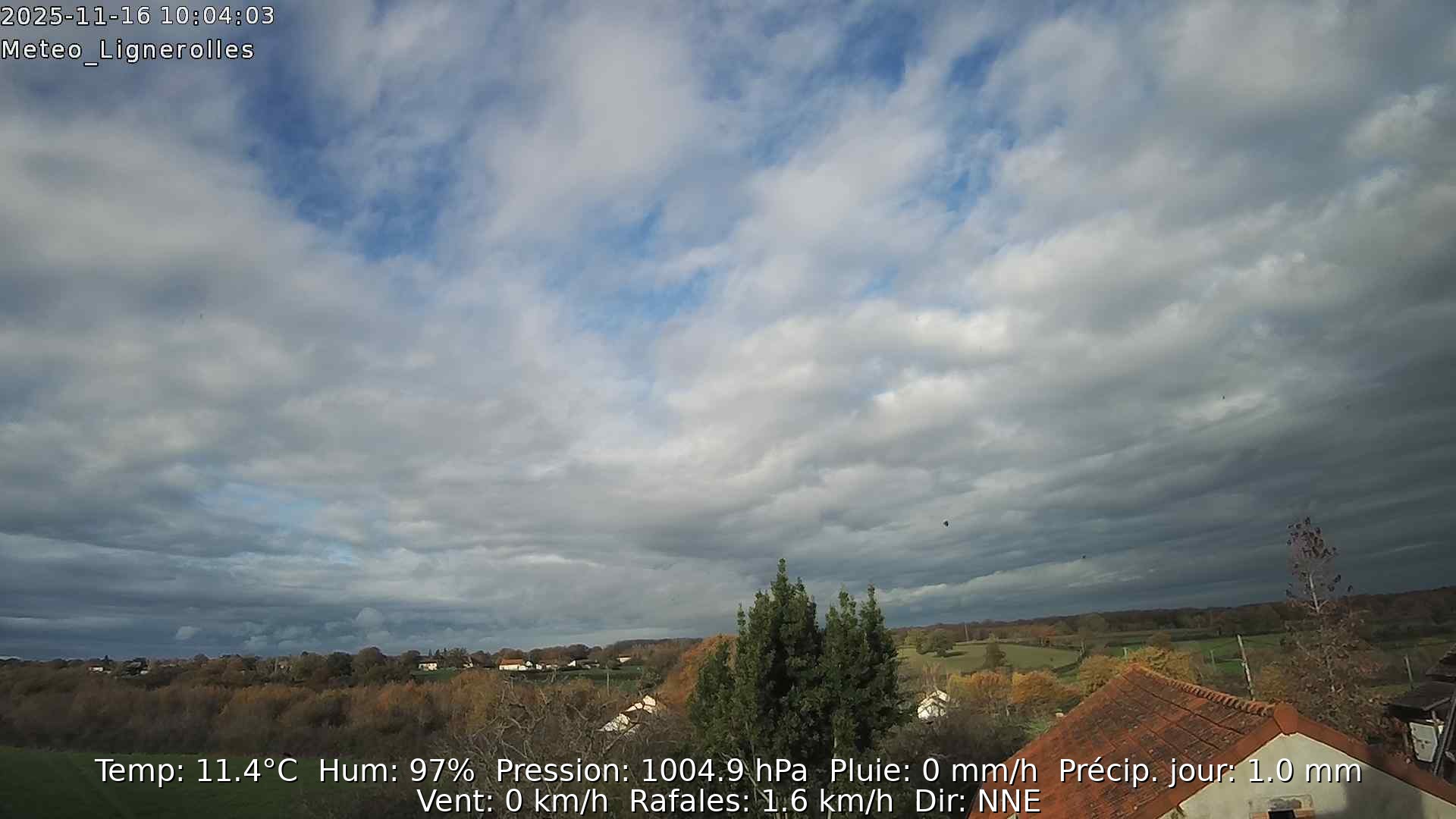 Température : 11.8°C - Ressenti : 10.3 - Tn : 8.9°C - Tx : 11.8°C - Humidité relative : 99 % - Vent : 10 à 15 km/h de Nord - Pression : 1007.3 hPa - Précipitations : 0 mm - ***** Hier : Tn : 8.2°C - Tx : 14.9°C - Précipitations : 6 mm - ******* Ce mois-ci : Tn : 4.2°C le 09 Novembre - Tx : 17.2°C le 06 Novembre - Cumul des Précipitations : 18 mm