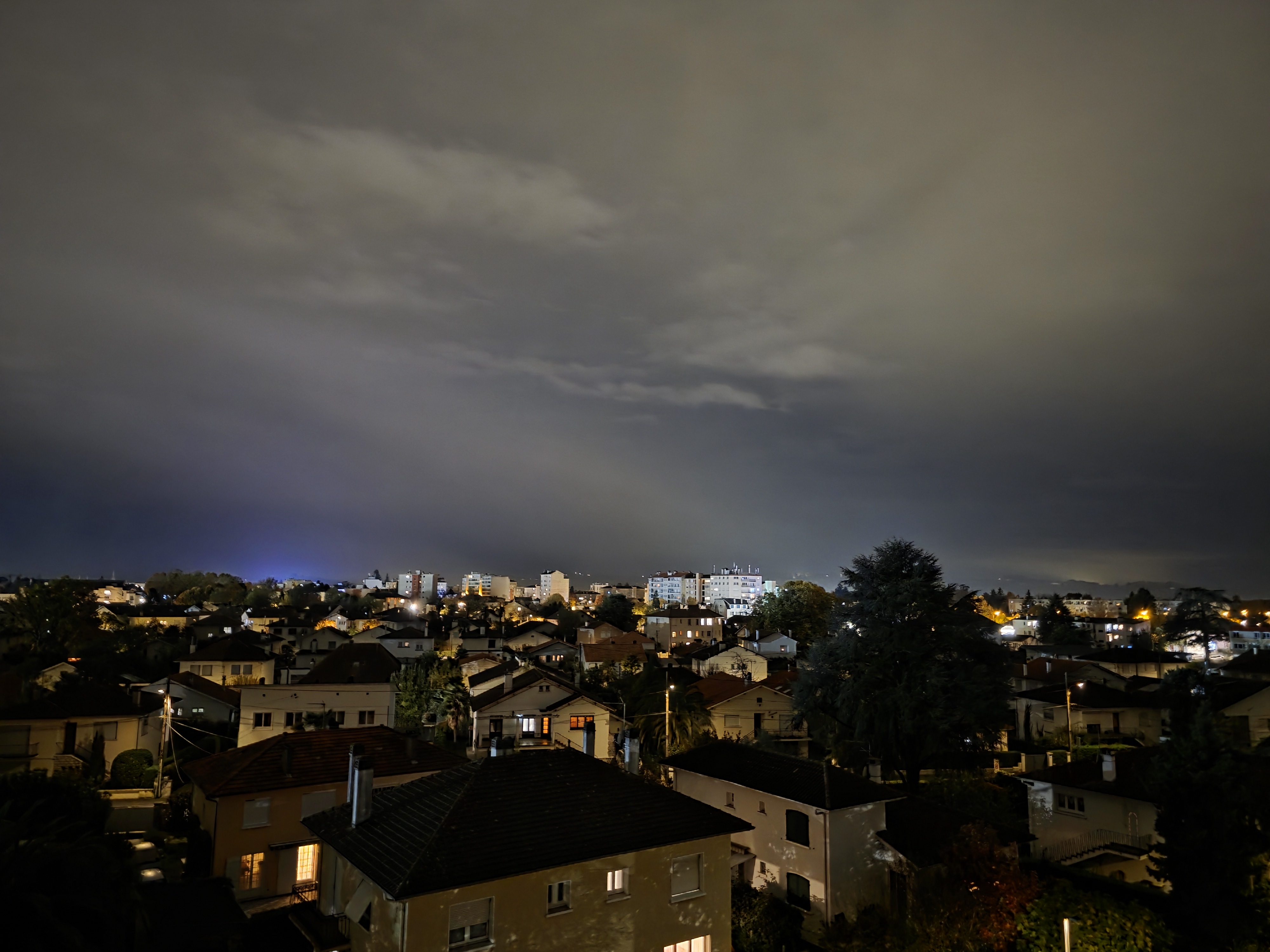 Pression : 1011 hPa. Vent : 5,4 km/h. Hygrométrie : 97%. Ciel avec des gros nuages et des étoiles, les rues sont mouillées.. |