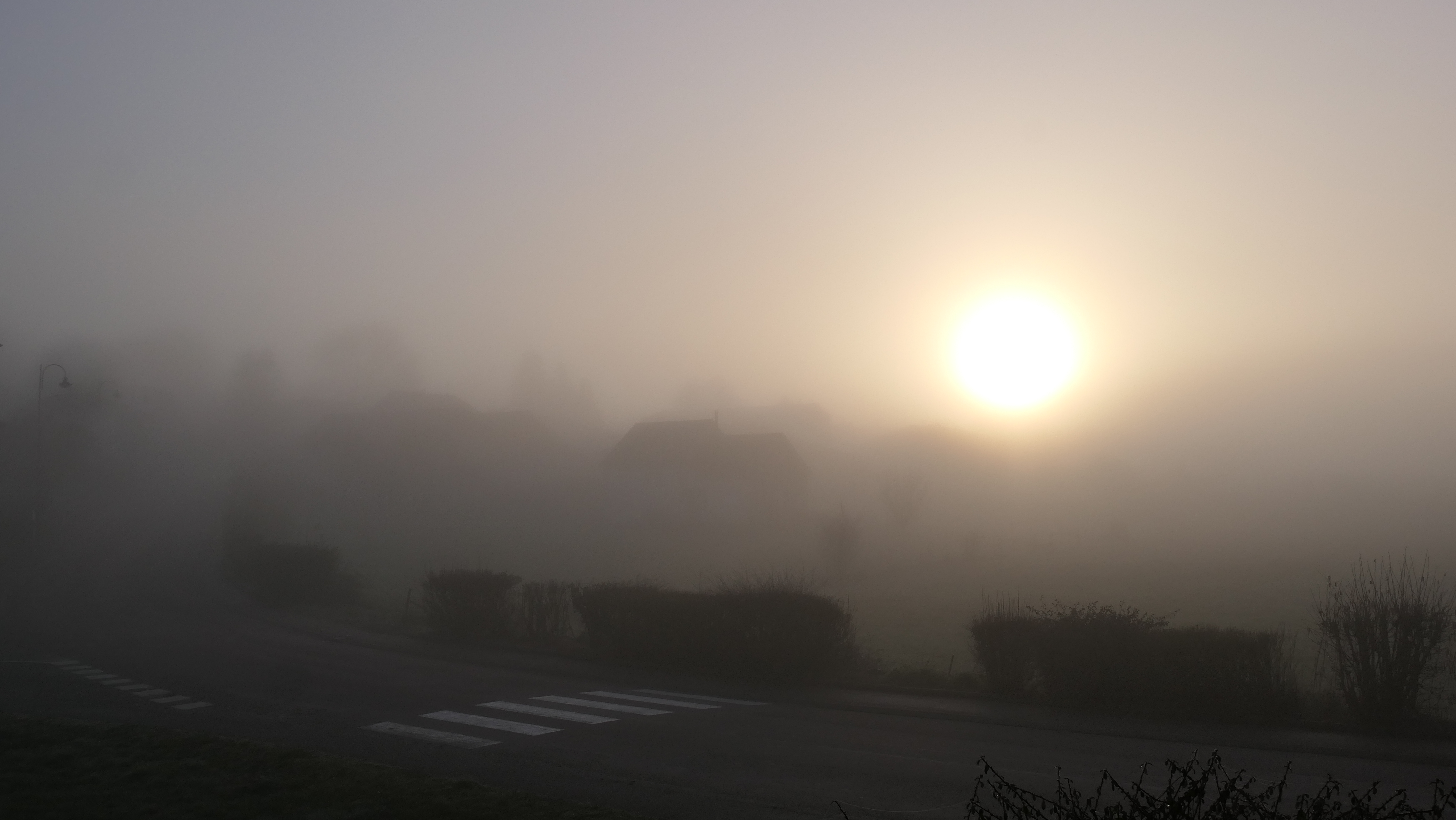 Brouillard assez dense mais le soleil perce progressivement. T 1°. Il est tombé 12mm de pluie depuis hier 15h. |