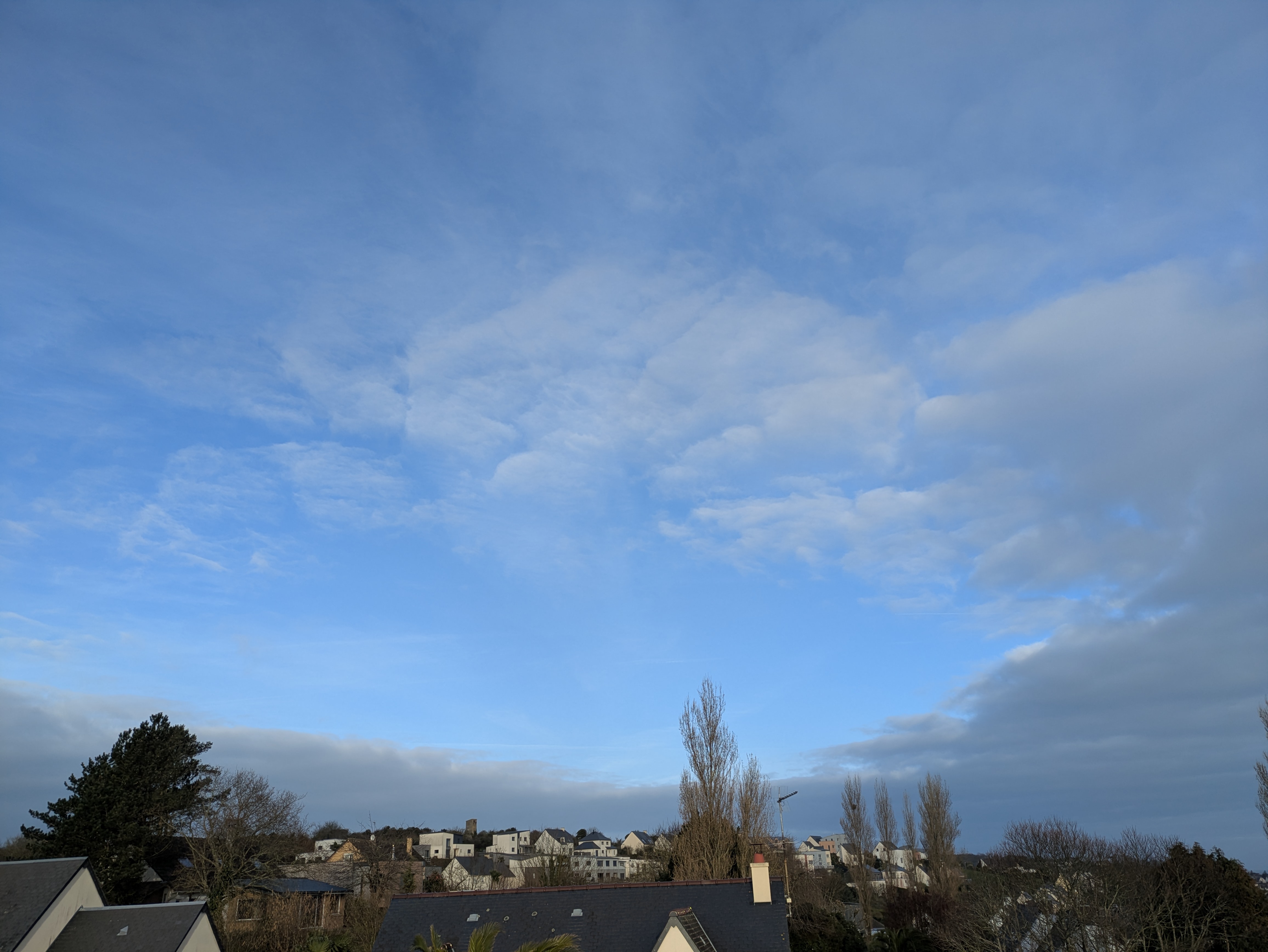 Le 11 / 03 : flux nuageux modéré ( NORD-WEST ) ; Nébulosité de 8 octas ( aurore ) puis entre 7 <--> 5 octas ( matin --> midi ) à 6 <--> 4 octas ( après-midi ) et morcellement progressif le soir : 4 --> 1 octa et 0 octa ( 23 h utc ) . 01 h 55 à 08 h 31 ( utc ) : passage de bruines faibles - pluies faibles à modérées épisodiques - gouttes éparpillées puis 09 h 30 à 11 h 59 ( utc ) : chutes épisodiques - périodiques de pluies faibles - gouttes éparpillées - bruines faibles - gouttes fines sporadiques . CIEL : Couvert à très nuageux ( aurore --> midi ) puis mitigé <--> très nuageux + éclaircies furtives à modérées ( après-midi ) et peu nuageux ( soir ) à étoilé - clair - dégagé ( nuit ) . Sol mouillé ( avec flaques ) : aurore --> matin ) puis humide ( midi ) à sec ( après-midi --> soir ) . *************************************** Température de l' air : + 4,3 °c . Pression atmosphérique : 1025,1 hPa . Humidité de l' air : 94,3 % . Total des précipitations / 24 heures : 05,8 mm . Rafale max : 45,1 km/h ( WEST ) . Ensoleillement : 06 heures 01 minute . Visibilité : 17 km 870 mètres . Evapotranspiration : - 02,2 mm . Rivière : 0 M 42 ( 19 h utc ) . |
