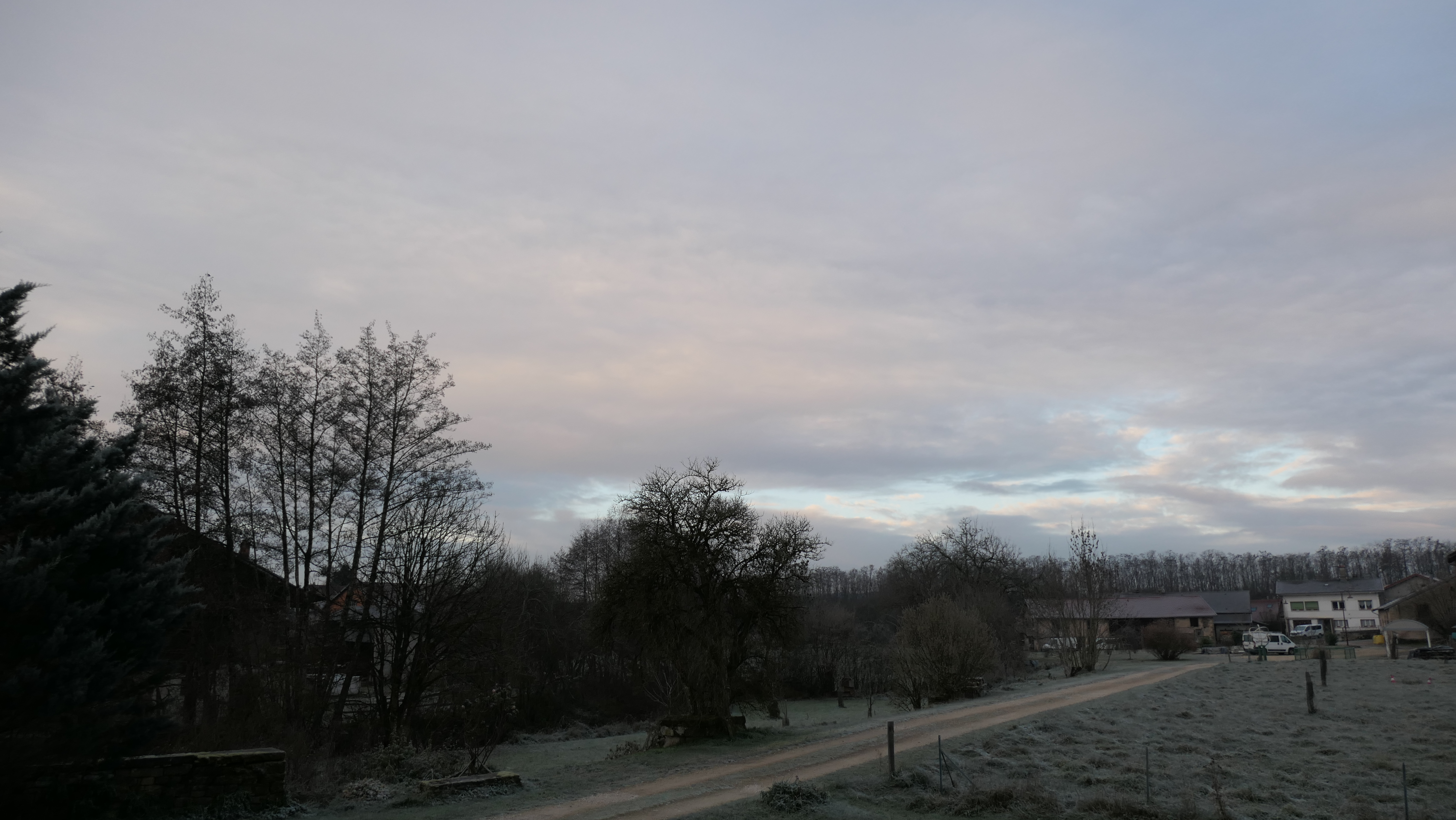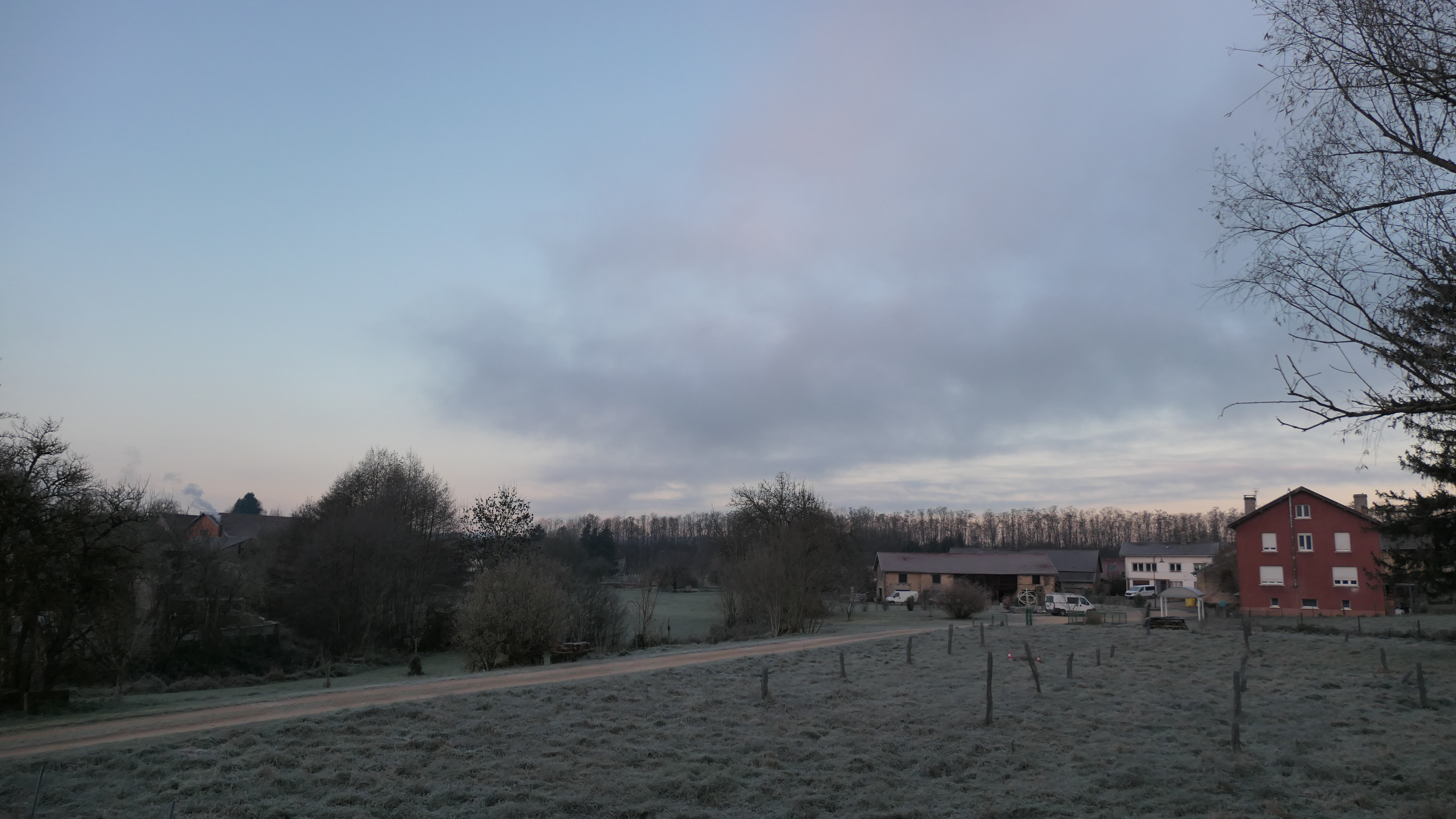 Gelée et brouillard mas le soleil ne semble pas loin de percer. T -2°.