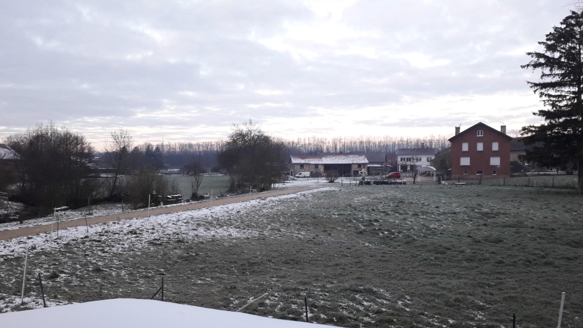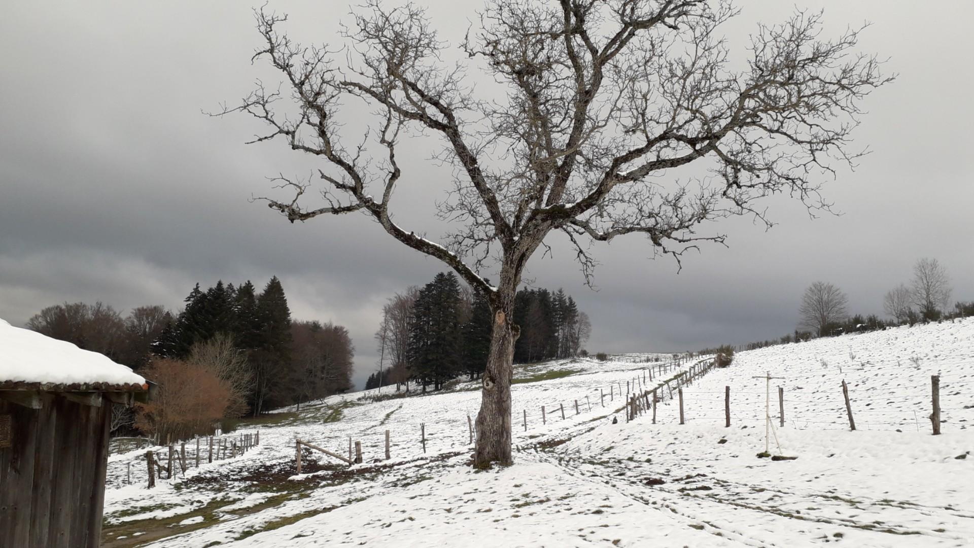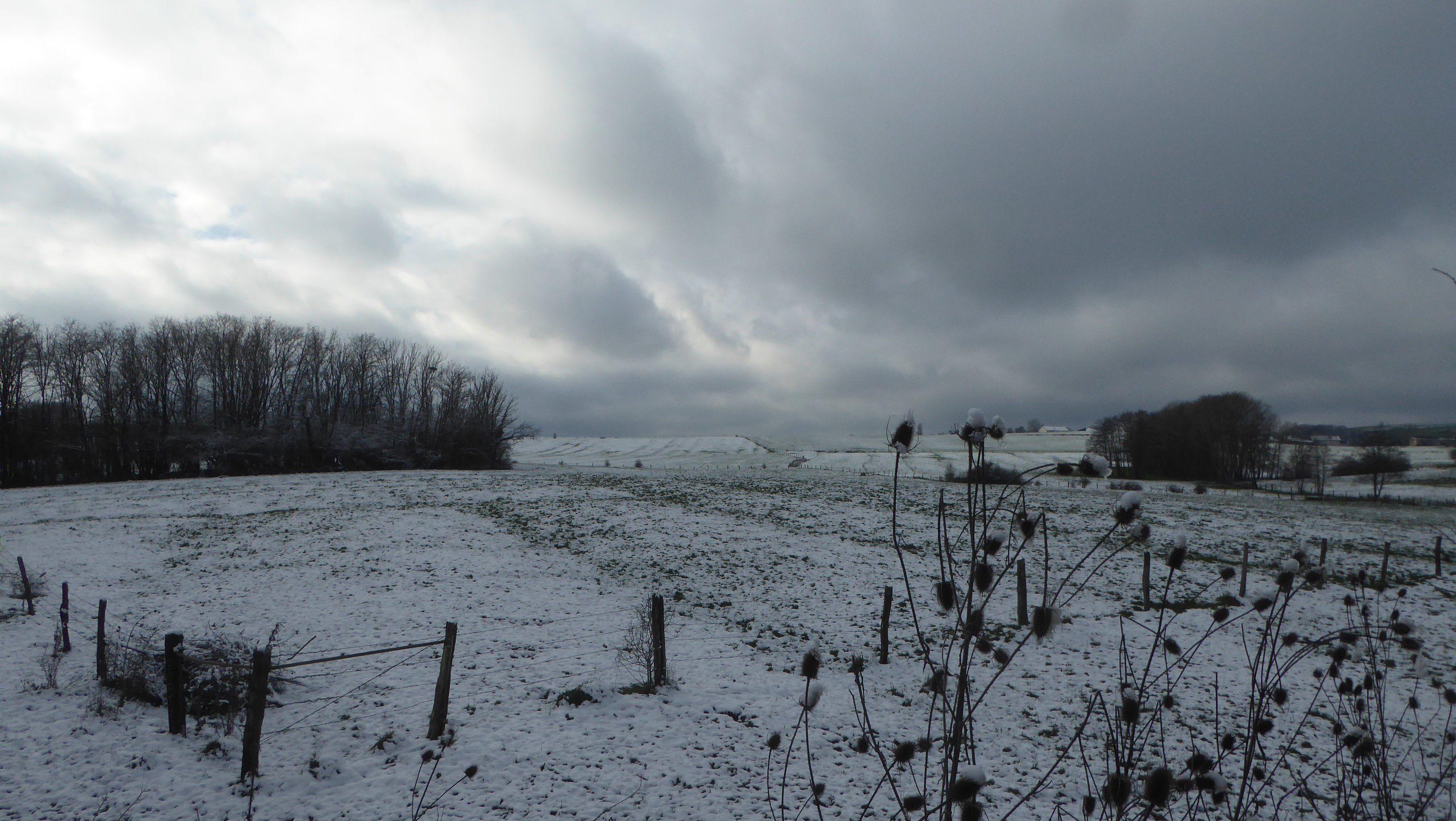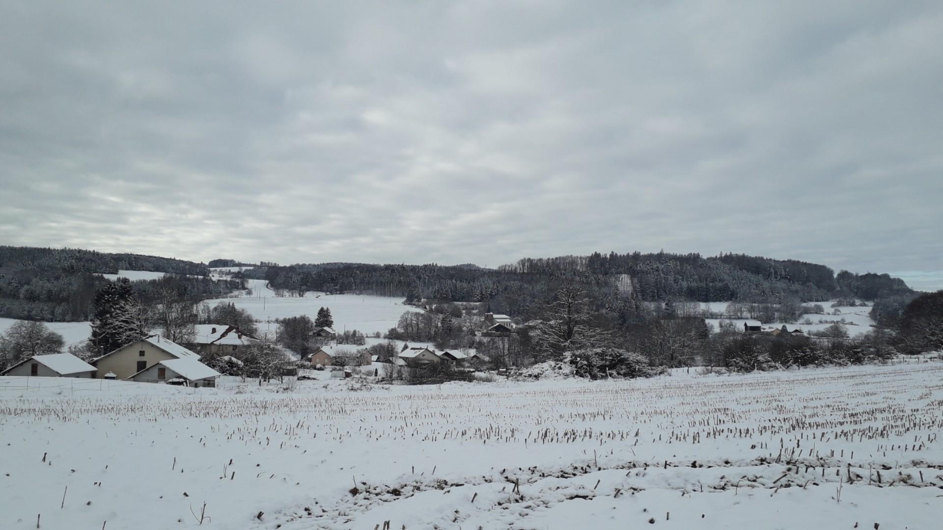 Ciel couvert, à peine de neige ici mais qui persiste avec les températures froides. Vent de NE sensible. T 1°