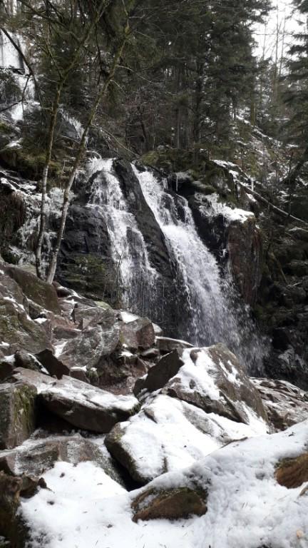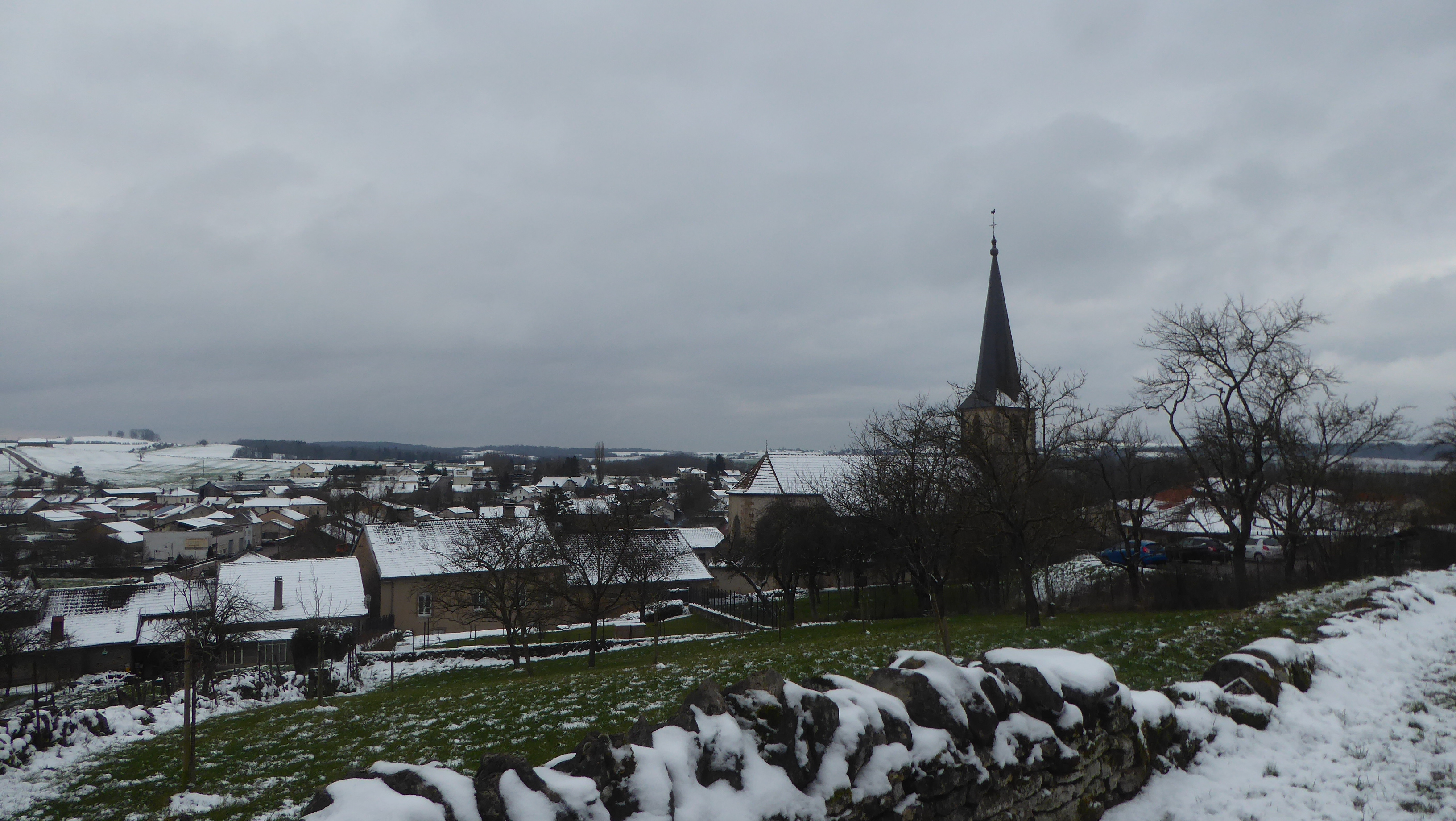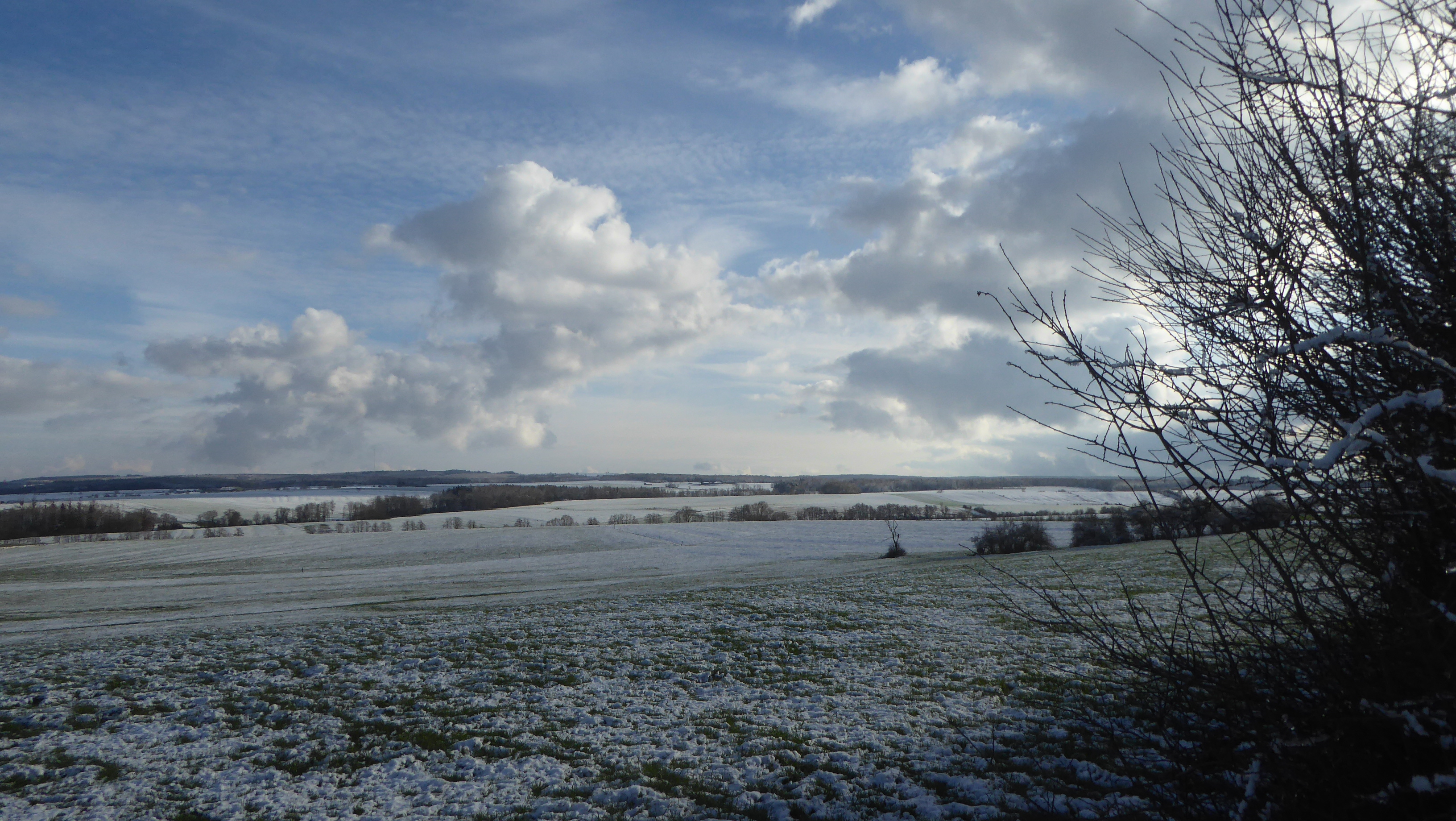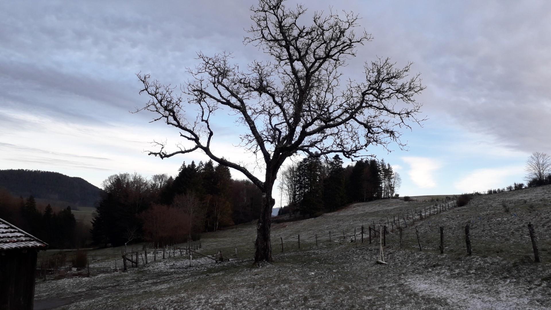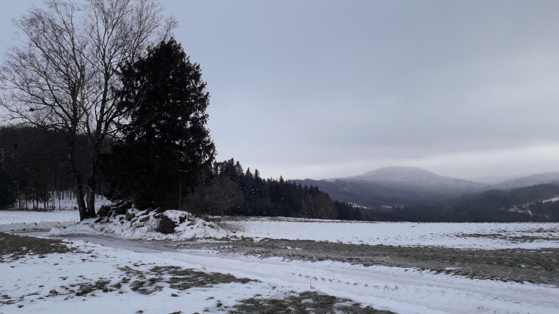 Ciel couvert, à peine de neige ici mais qui persiste avec les températures froides. Vent de NE sensible. T 1°