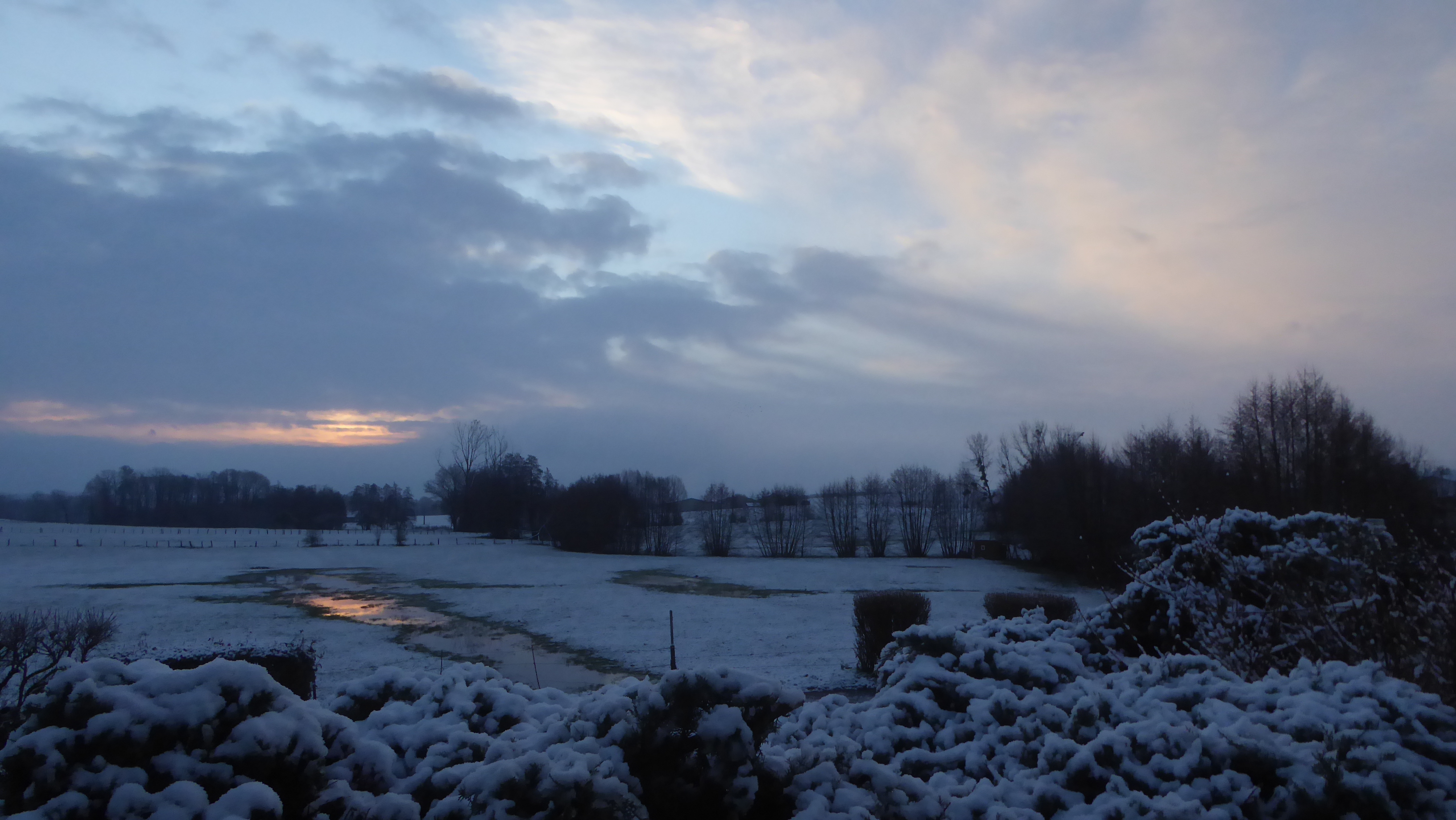 La pluie a fini par devenir neige hier soir. A peine quelque cm mais de quoi donner un joli paysage hivernal malgré tout. T 1°.
