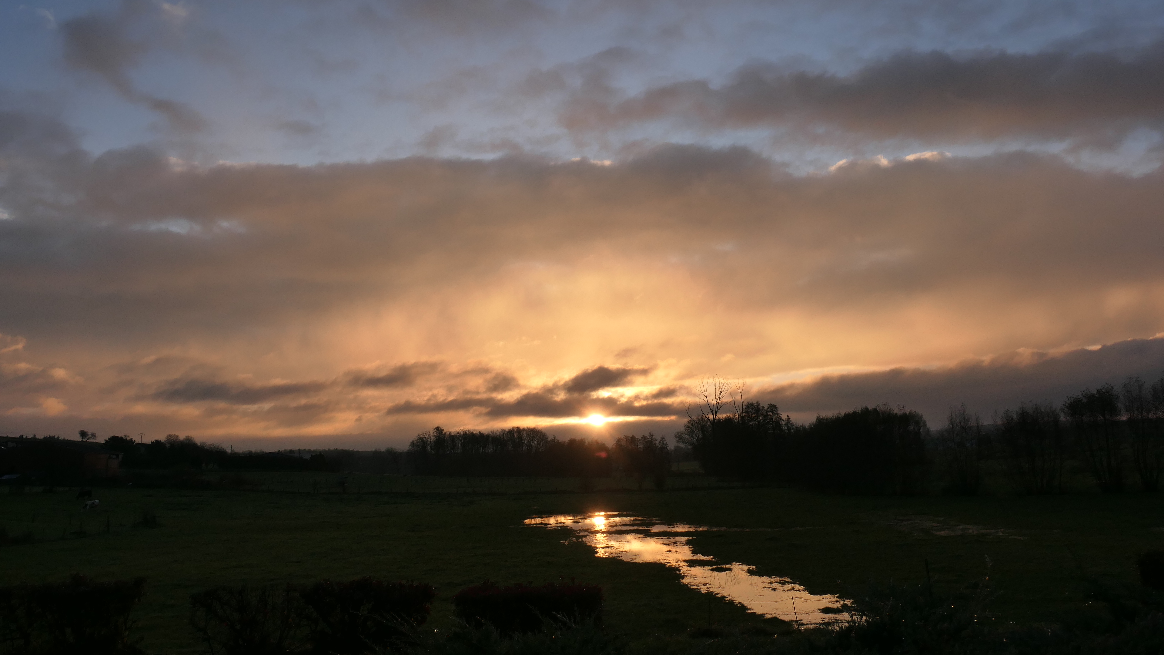 Lever de soleil après avoir eu 48mm de pluie en 24h dont 40mm en fin de journée et soirée d'où cette eau présente dans les champs. Plus frais ce matin avec 2°.