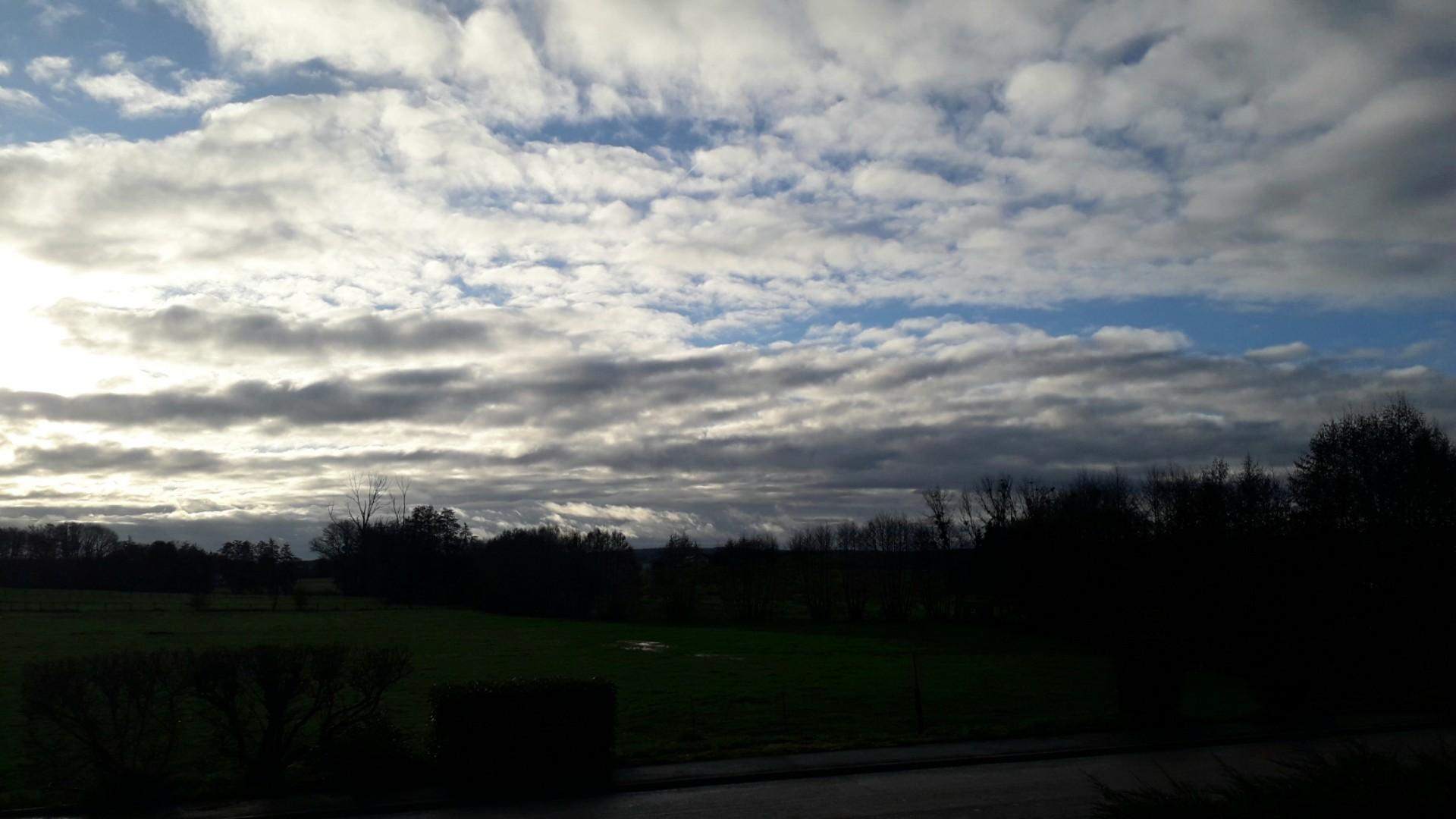 Ciel couvert, lumineux avant le retour d'averse. T 12°. Vent O-SO.