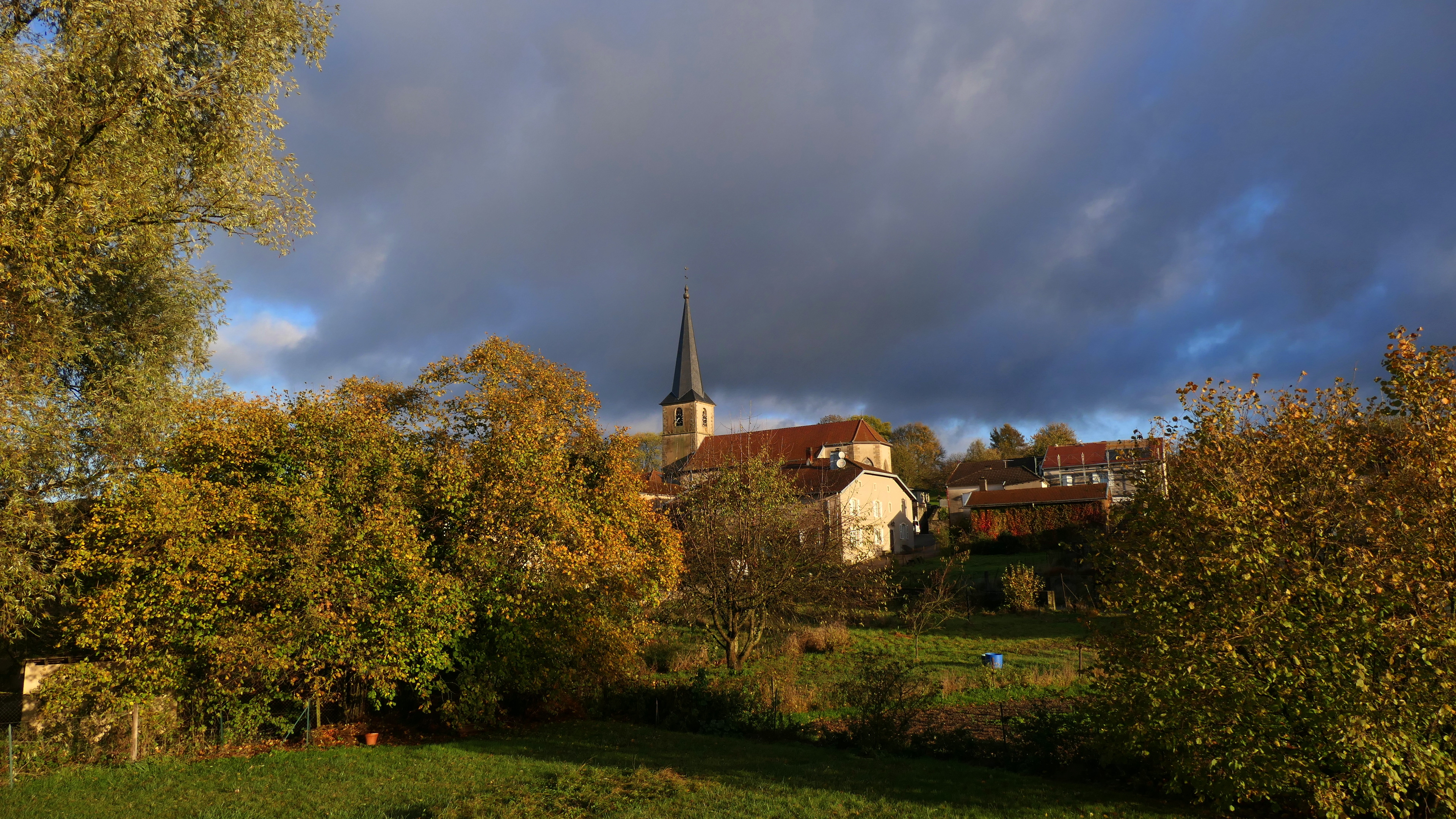 Belle lumière automnale au lever du soleil, ciel nuageux, vent faible. T 8°.